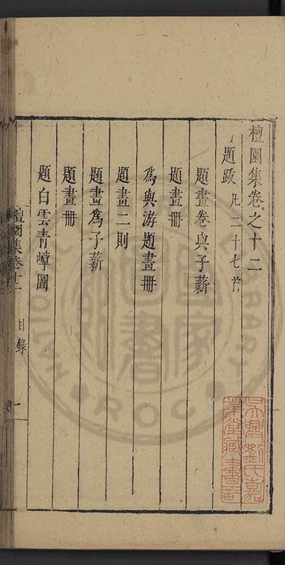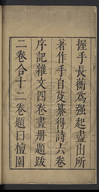 握手長蘅為强起盡出所著作手自芟纂得詩六卷序記雜文四卷畫冊題跋二卷合十二卷題曰檀園