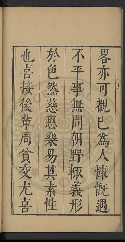 畧亦可覩巳為人慷慨遇不平事無問朝野輙義形於色然慈惠樂易其素性也喜接後輩周貧交尤喜
