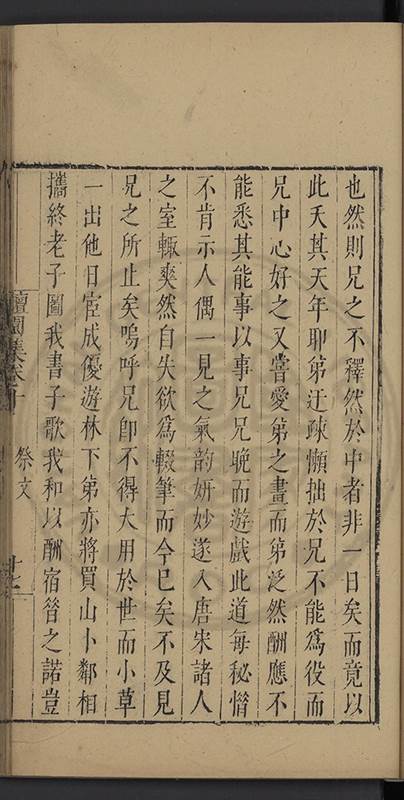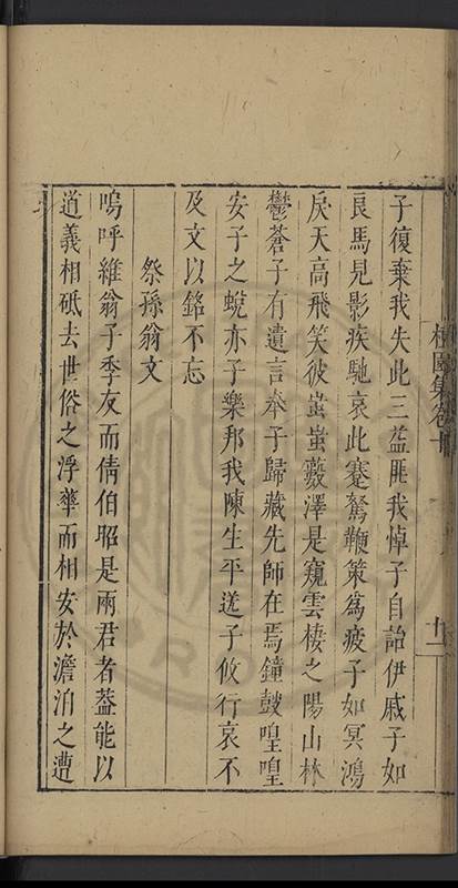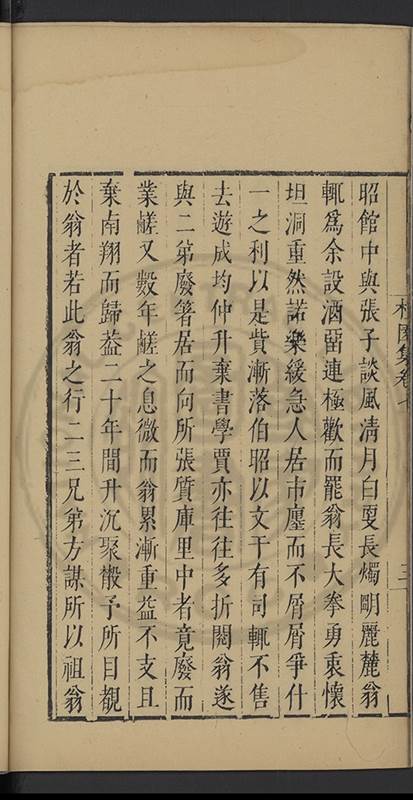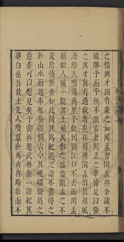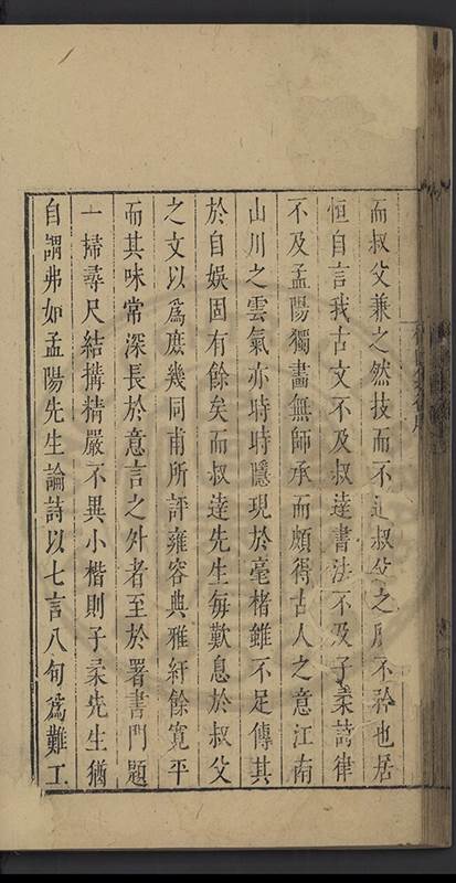 而叔父兼之然技而不 叔父之 不矜也居恒自言我古文不及叔達書法不及子柔詩律不及孟陽獨畫無師承而頗得古人之意江南山川之雲氣亦時時隱現於毫楮雖不足傳其於自娛固有餘矣而叔達先生每歎息於叔父之文以為庻幾同甫所評雍容典雅䊹餘寬平而其味常深長於意言之外者至於署書門題一掃尋尺結構精嚴不異小楷則子柔先生猶自謂弗如孟陽先生論詩以七言八句為難工