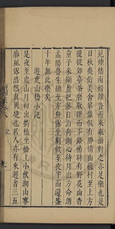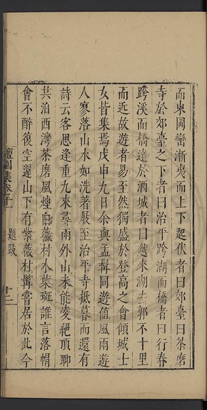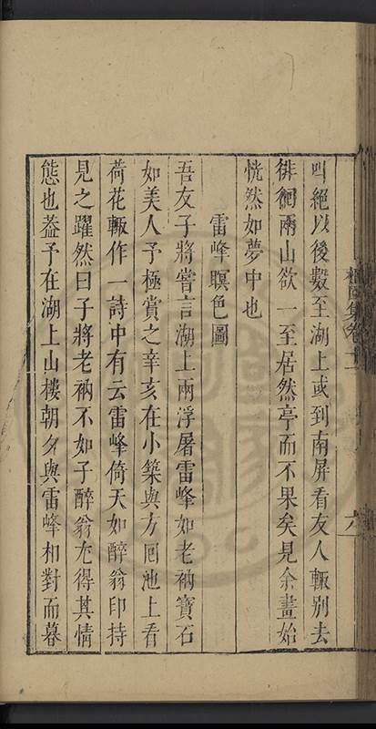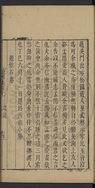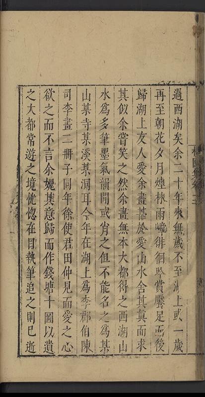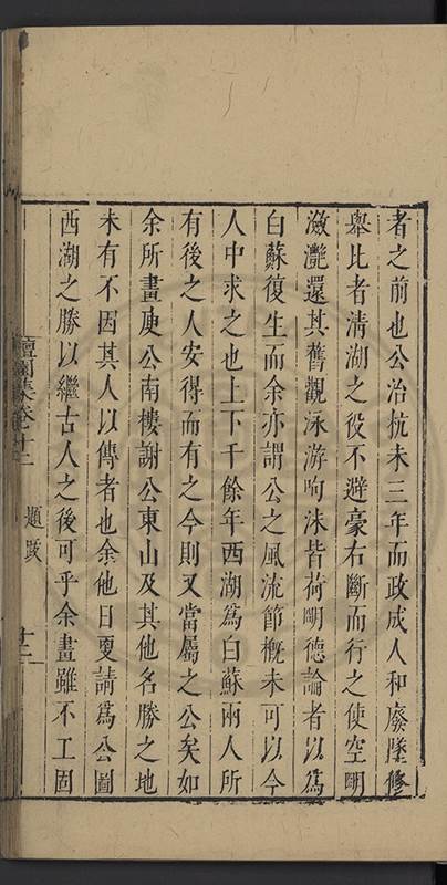 者之前也公治杭未三年而政成人和廢墜修舉比者清湖之役不避豪右斷而行之使空朙瀲灔還其舊觀泳游呴沬皆荷朙徳論者以為白蘇復生而余亦謂公之風流節概未可以今人中求之也上下千餘年西湖為白蘇兩人所有後之人安得而有之今則又當屬之公矣如余所畫庾公南樓謝公東山及其他名勝之地未有不因其人以傳者也余他日㪅請為公圖西湖之勝以繼古人之後可乎余畫雖不工固