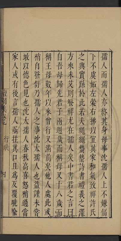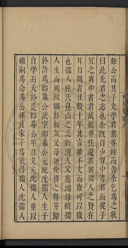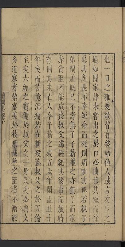 篤於君臣之義如此事我王父生盡誠而死盡哀終䘮三年杖而後起其事王母益竭色養之孝既登賢書猶在子舎四方脩脯之餽必奉持而歸之王母二十年不私名一錢從母專愚不辨菽麥叔父以種祠之重勉置副室然而如賔之敬終身不衰兄弟五人先太史獨蚤世叔父思勤宜之不啻已子敬長兄而慈幼分王父所授薄田不滿百畆大半以周弟妹之貧郡邑有司之試苟可以薦剡達者終不以已子先從子