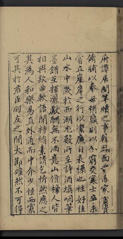 府譚居閒竿牘之事 頭面 赤家貧資備脯以奉毋稍贏則以分窮交寒士卒未𡮢立崖岸之行以潔廉自表𥛧也性好佳山水中嵗扵西湖尤數所至詩酒填𠲛筆墨錯互揮灑獻酬無不滿意山僧榜人皆相與欸曲軟語閒持絹素請乞忻然應之其為人和樂易直外通而中介少怪而寡可其扵君臣朋友之閒大莭確然不可得