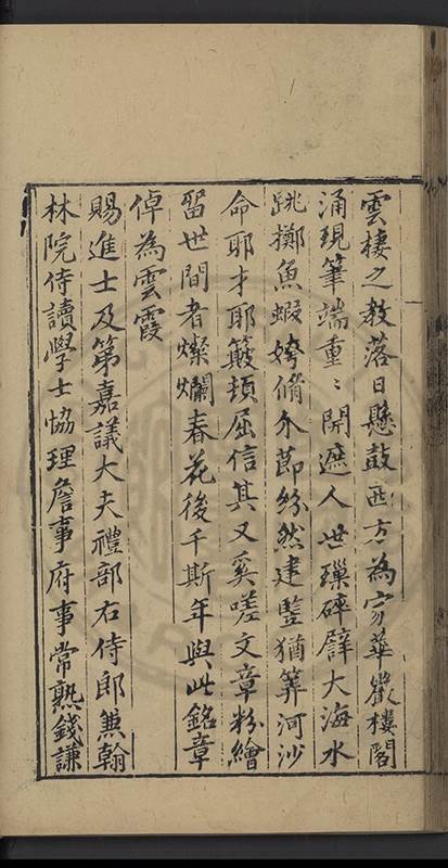 雲棲之教落日懸鼓西方為家華巖樓閣涌現筆端重重開遮人世璅碎辟大海水跳擲魚蝦姱脩爪莭絲然建鍳猶筭河沙命耶才耶簸頓屈信其又奚蹉文章粉繪畱世間者燦爛春花後千斯年與此銘章倬為雲霞賜進士及第嘉議大夫禮部右侍郎𠔥翰林院侍讀學士恊理詹事府事常熟錢謙
