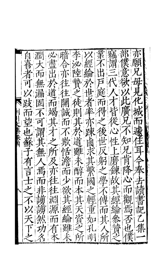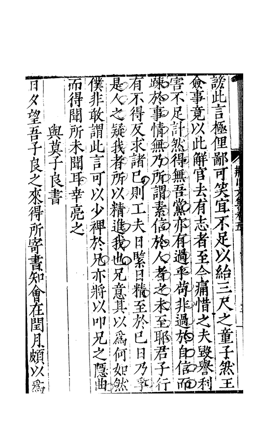 兄萬無洩我秘宻重增嘵嘵之口也安友爲我求序得託雄文以不朽甚幸過望僕舊從兄學爲文章有一二僅得處盡是兄之指教但才旣不長又不能竭精力以從事是以遂成廢罷韓子所謂徙業者不嚌其胾者也獨覺兄之奔逸絶塵而已矣近来自觀舊稿支離叛道之言篇篇有之理旣不當文亦未工赧然盡欲焚燒而後爲快縁頗爲人抄録無可柰何盖以吾今日文字伎倆須并却三四年精力專專幹此一事自謂可望於古閫域今自度必無此閒精神可以了此也旣自知不了則豈欲以不了者而信今傳