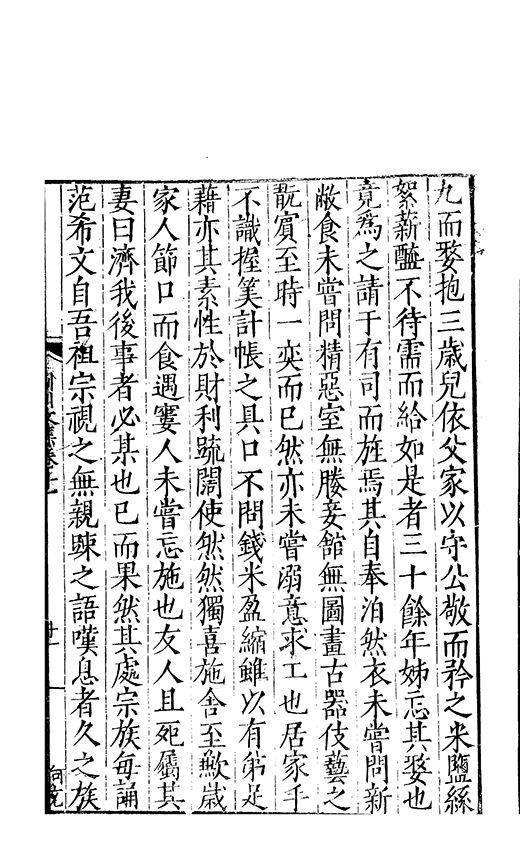 粟帛八十以上冠帶翁於是始冠帶然始一服之後不更服也嘗一與蜡賔後太守連歳以故事請然亦不更往其好省事如此始翁壯時唐氏以給事公故方盛給事公自爲庠生有名聲已能盡致數邑客後爲給事賔客益輳翁家居則應接賔客出則從親朋隣里邀請酒殽之會投壺陸博遨逰宴笑之歡碌碌不絶翁每所過輙爲上客議論常摧其一座人以是人益貌之後翁既老兄弟物故盡平生故人多不存存者亦衰且病不能相往來矣翁又失其壯子獨携二幼孫以居雖門外終歳率不一出甘脆滫滑所以