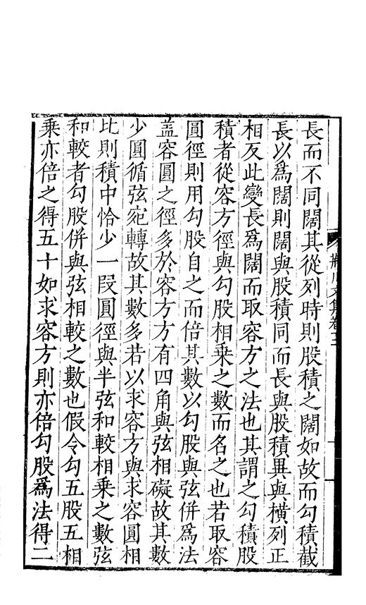 長而不同闊其從列時則股積之闊如故而勾積截長以為闊則闊與股積同而長與股積異與横列正相反此變長為闊而取容方之法也其謂之勾積股積者從容方徑與勾股相乗之數而名之也若取容圓徑則用勾股自之而倍其數以勾股與弦併為法盖容圓之徑多於容方方有四角與弦相礙故其數少圓循弦宛轉故其數多若以求容方與求容圓相比則積中恰少一叚圓徑與半弦和較相乗之數弦和較者勾股併與弦相較之數也假令勾五股五相乗亦倍之得五十如求容方則亦倍勾股為法得二