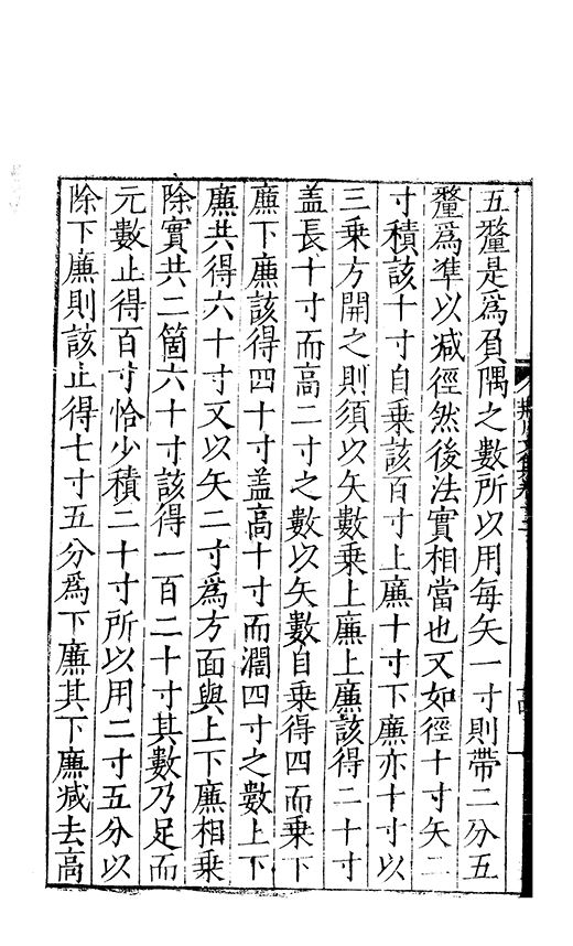 足且夫圓凖於方而畸零之圓又凖於均齊之圓以方為率徑十寸矢一寸則積必是十寸矢二寸則積必是二十寸但得積為實只約矢與徑為從平方開之足矣盖方無虚隅也又以整圓為率徑十寸矢五寸則圓積必居方積四分之三而以四之一為虚隅足矣盖雖有虚隅而其數易凖也惟是矢以漸而短則積以漸而减有不能及四分之三虚隅以漸而加有不止於四分之一者矣於是平方法與四分而一爲虚隅之法皆不可用惟自乗平方之積爲三乗而以四分之矢减五分之徑則不問矢之長短積與虚