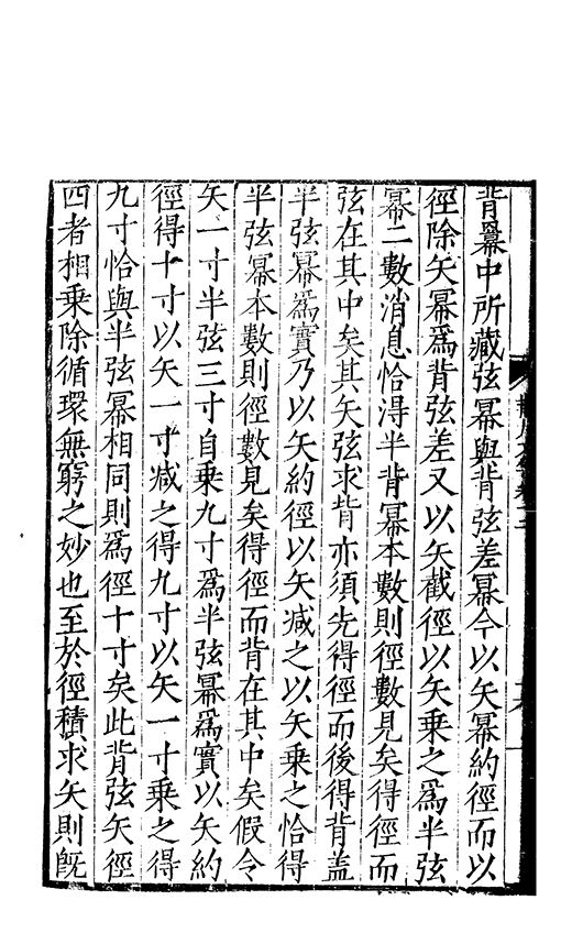 半背冪中藏一箇半弦冪與矢相除而加矢之徑數藏一箇矢冪以徑數相除為背弦差之數二數消息恰得半背冪本數則矢數見矣假令徑十寸矢一寸半背弦差一分半背數三寸一分自乗得九寸六分一釐其九寸為弦冪所謂中藏半弦冪與矢相除而加矢之徑數其六分一釐乃是兩半背冪而空其一差亦名差與半背相開方之數即以與其差一分相乗之數所謂一箇矢冪以徑數相除為背弦差之數也二數消息以盡背冪而法可立矣其背矢求弦法若背矢先求出徑而後以矢徑求弦則為簡捷盖半