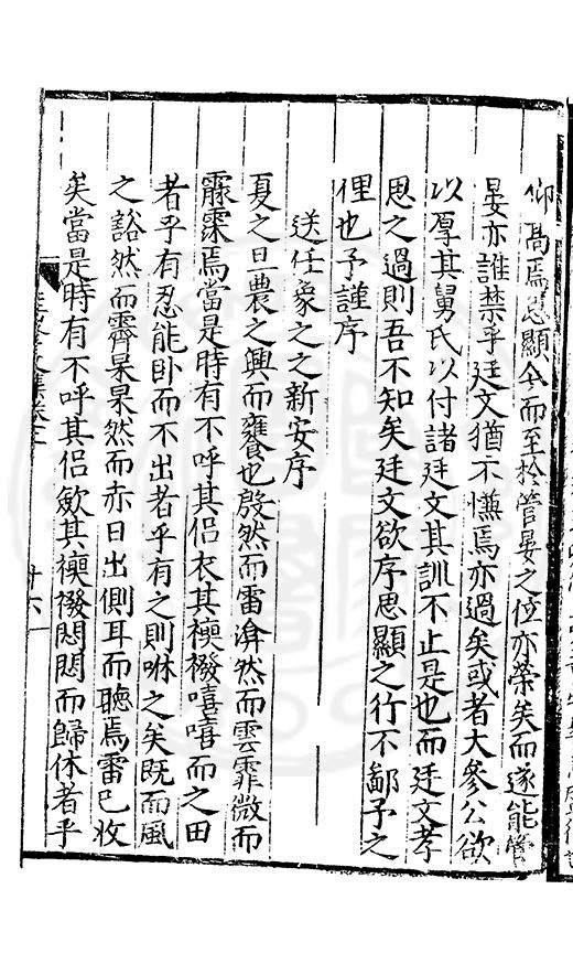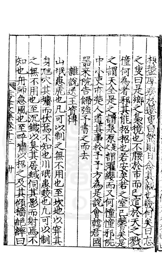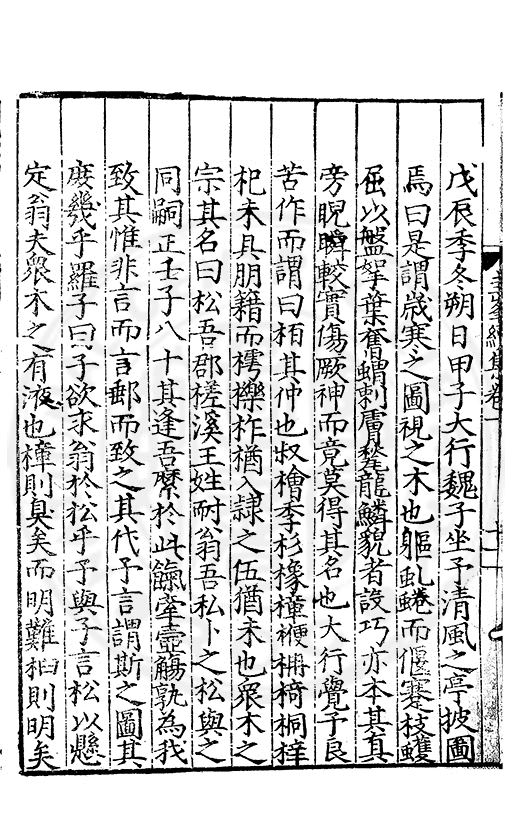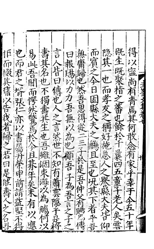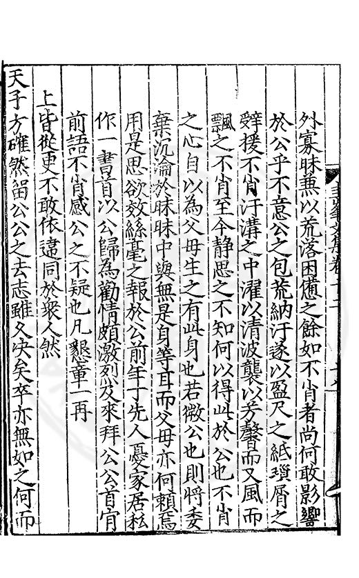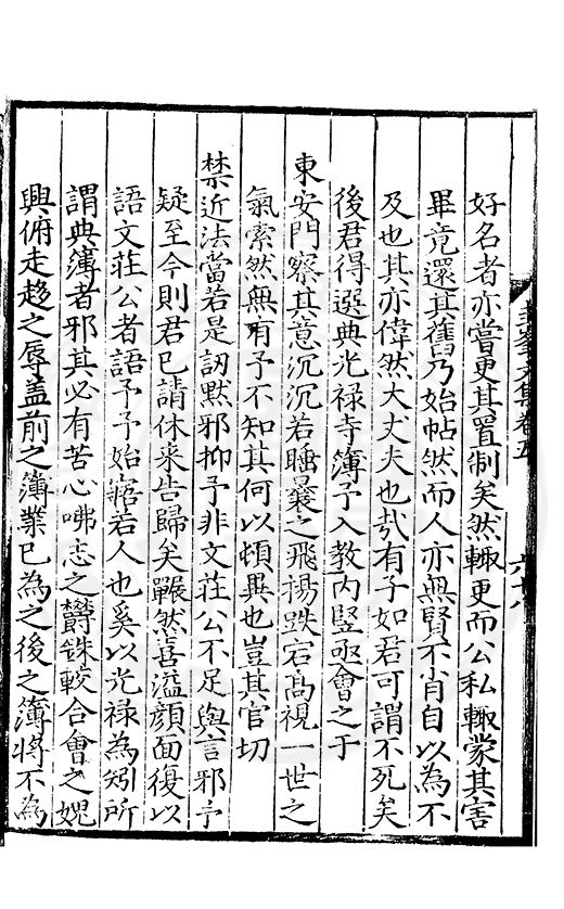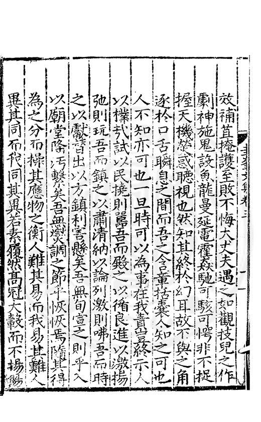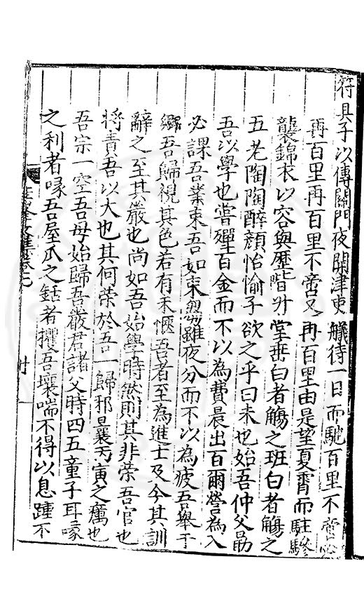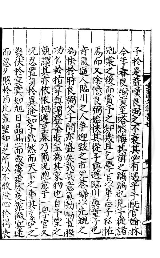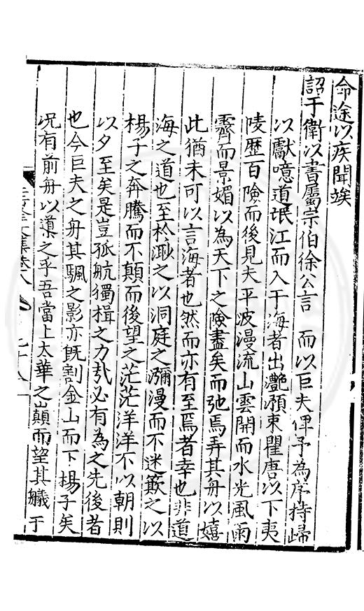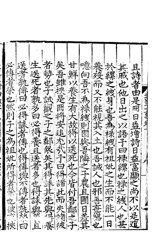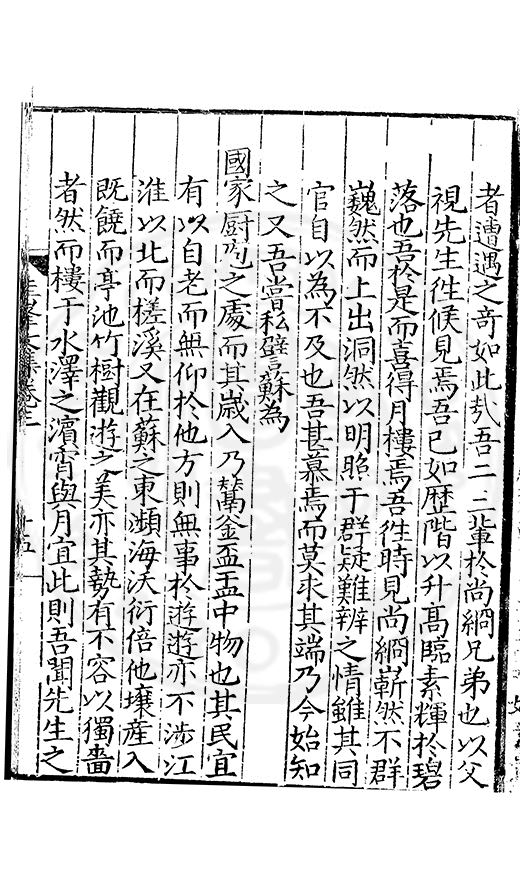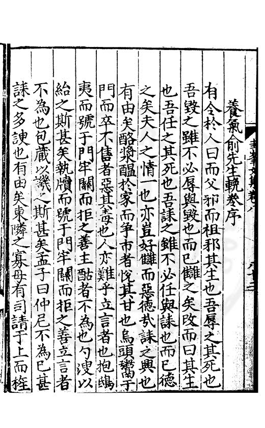尋其脉絡則自龍門禹宂逺不可窺說者謂先生之言出左氏愚獨謂其直泝盤誥之支餘也雖然亦豈易能哉□者宋元君召畫史一史後至儃儃然獨就舘舎觧衣盤礴累日乃命筆則入神矣聞先生為文必嘔心積慮至扃戸牗或距木石隱度逾旬日或遲嵗時神生境具而後命筆稍渉扵萎陋詘誕之微雖