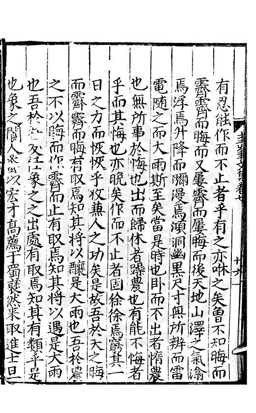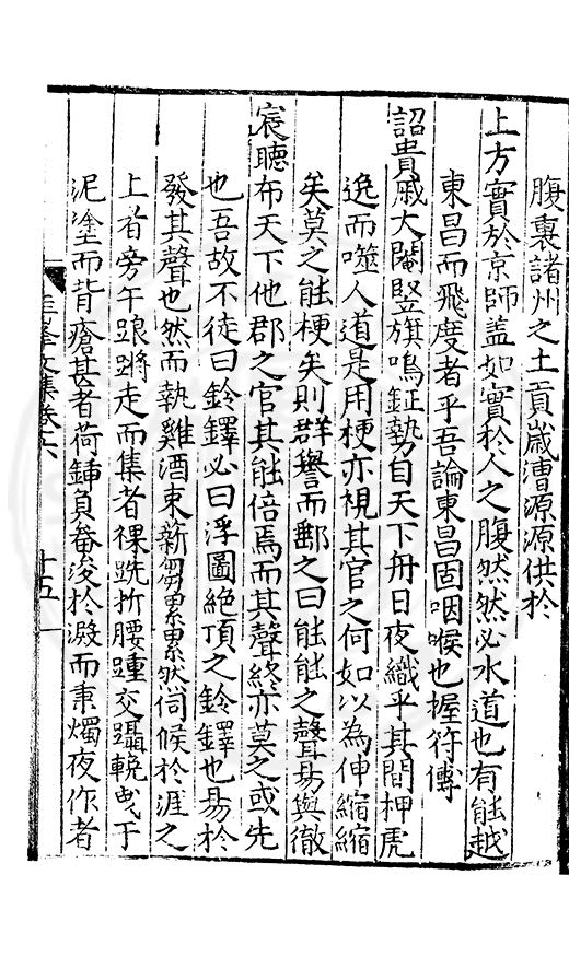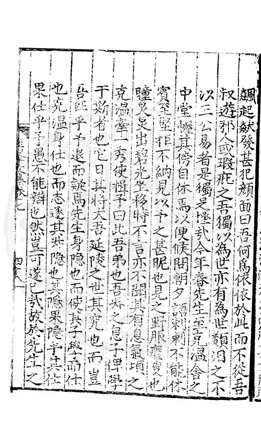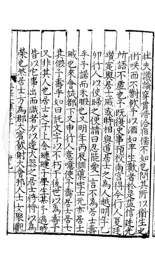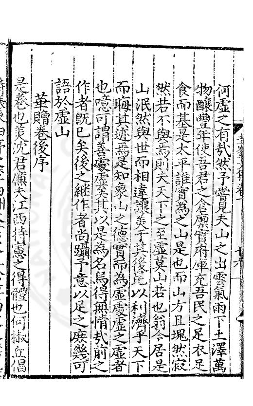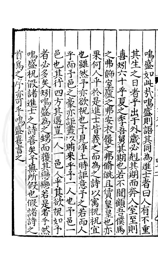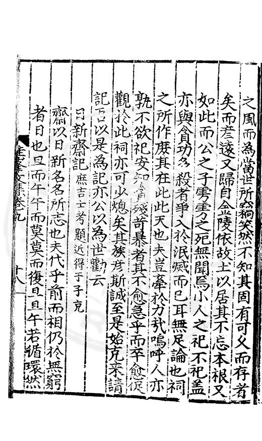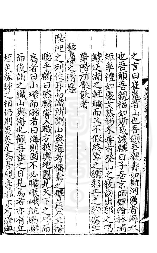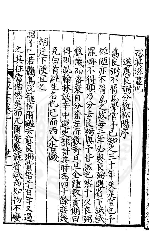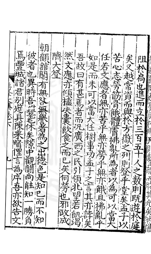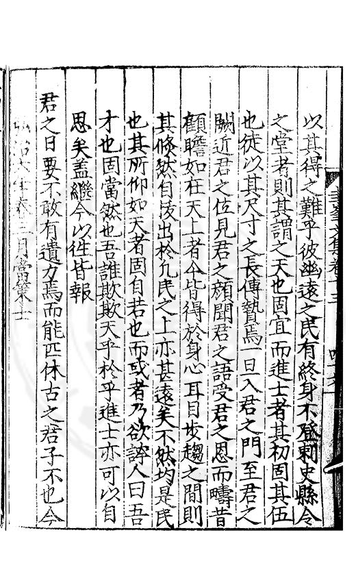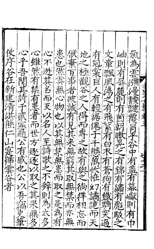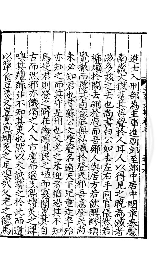 尋其脉絡則自龍門禹宂逺不可窺說者謂先生之言出左氏愚獨謂其直泝盤誥之支餘也雖然亦豈易能哉□者宋元君召畫史一史後至儃儃然獨就舘舎觧衣盤礴累日乃命筆則入神矣聞先生為文必嘔心積慮至扃戸牗或距木石隱度逾旬日或遲嵗時神生境具而後命筆稍渉扵萎陋詘誕之微雖