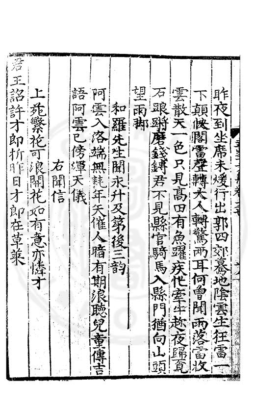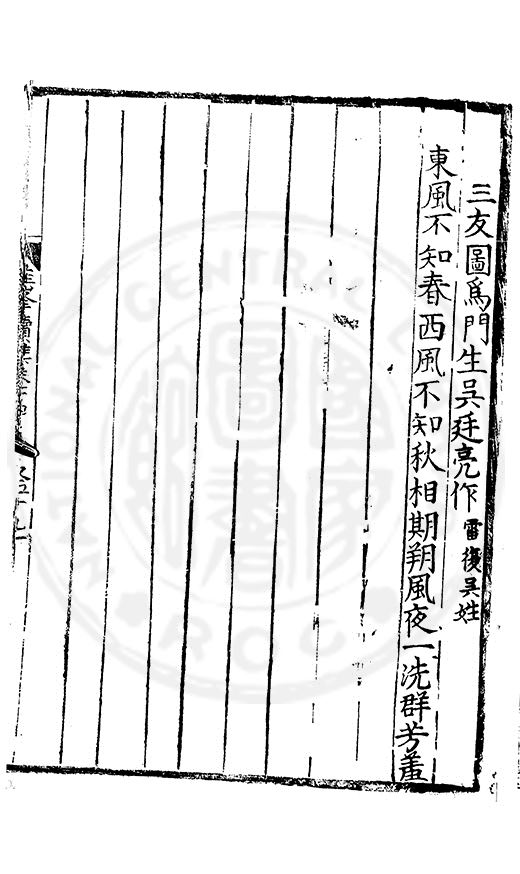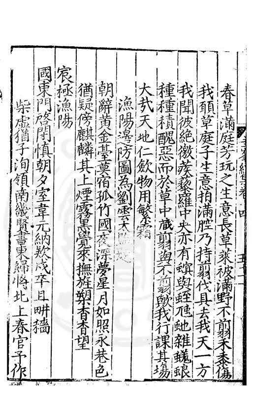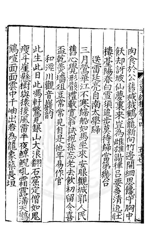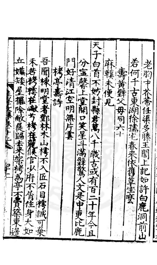 白霧下赤壁素月篩青林風露變草木魚鳥觧晴隂蛟潭湛潏潏鷗波去沉沉島嶼上下勢舟船來去心此亭對此景一鶴與一琴琴音諧韶護鶴性甘蕭森春濃十里竹秋静萬家砧象罔溟蒙合雲雷屯伏深主人葛天氏不信有朝簮