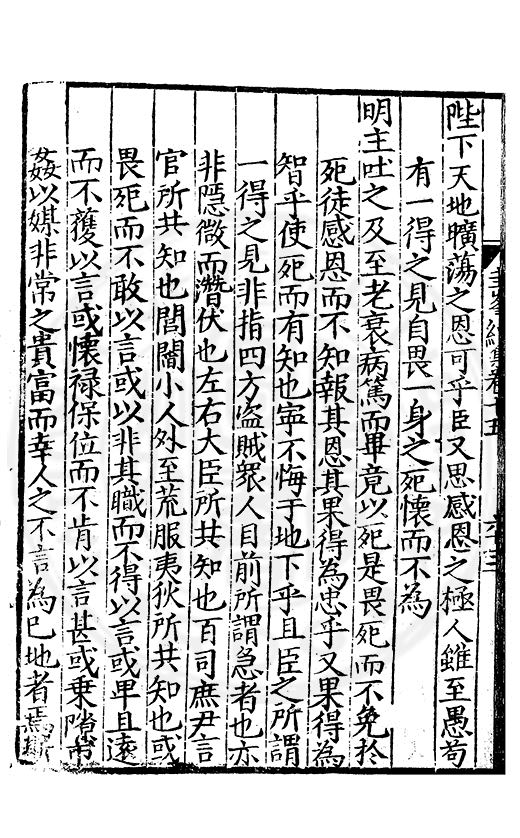 陛下天地曠蕩之恩可乎臣又思感恩之極人雖至愚茍有一得之見自畏一身之死懷而不為明主吐之及至老衰病篤而畢竟以死是畏死而不免扵死徒感恩而不知報其恩其果得為忠乎又果得為智乎使死而有知也寕不悔于地下乎且臣之所謂一得之見非指四方盗賊衆人目前所謂急者也亦非隱微而濳伏也左右大臣所共知也百司庶尹言官所共知也閭閻小人外至荒服夷狄所共知也或畏死而不敢以言或以非其職而不得以言或卑且逺而不獲以言或懷禄保位而不肯以言甚或乗隙市姦以媒非常之貴富而幸人之不言為巳地者焉斯