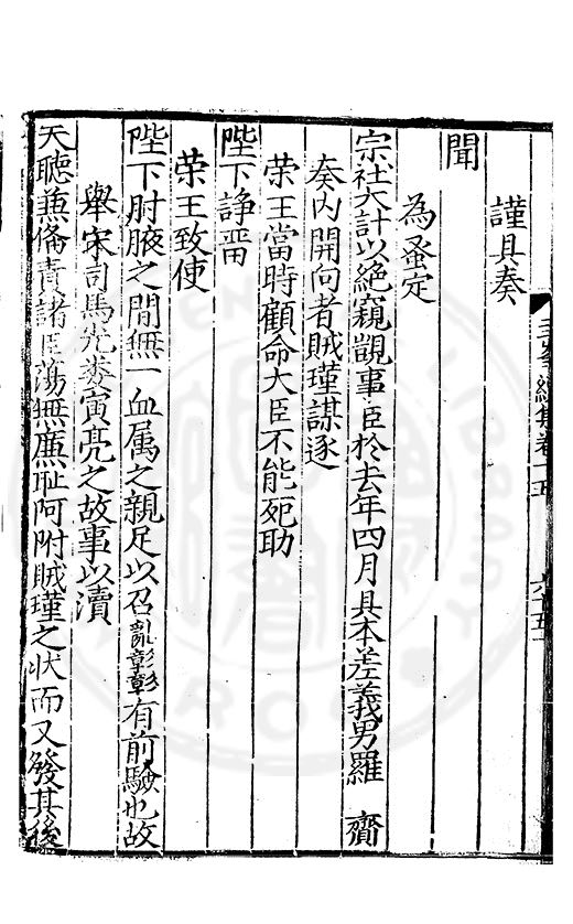 為蚤定宗社大計以絶窺覬事臣扵去年四月具本差義男羅 齎奏内開向者賊瑾謀逐荣王當時顧命大臣不能死助陛下諍留荣王致使陛下肘腋之間無一血属之親足以召亂彰彰有前驗也故舉宋司馬光娄寅亮之故事以凟天聴兼俻責諸臣蕩無廉耻阿附賊瑾之状而又發其後