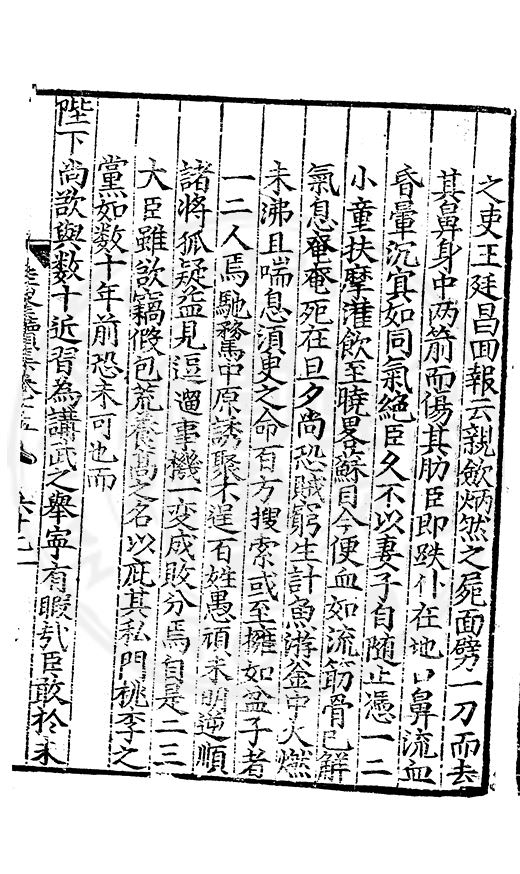 之吏王廷昌囬報云親歛炳然之屍面劈一刀而去其鼻身中兩箭而傷其肋臣即跌仆在地口鼻流血昏暈沉冥如同氣絶臣乆不以妻子自随止憑一二小童扶摩灌飲至暁畧蘇目今便血如流筋骨巳觧氣息奄奄死在旦夕尚恐賊窮生計魚游釡中火燃未沸且喘息湏臾之命百方搜索或至擁如盆子者一二人焉馳騖中原誘聚不逞百姓愚頑未明逆順諸將狐疑益見逗遛事機一変成敗分焉自是二三大臣雖欲竊假包荒養高之名以庇其私門桃李之黨如数十年前恐未可也而陛下尚欲與数十近習為講武之舉寕有暇哉臣敢扵未